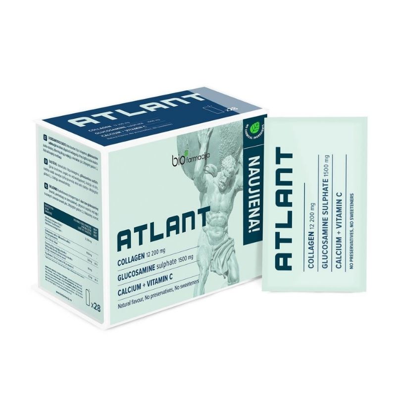 С высоким содержанием коллагена и глюкозамина БАД для поддержания здоровья суставов BIOFARMACIJA Atlant. Комплекс коллагена и глюкозамина, обогащенный кальцием и витамином C. Коллаген — это белок, который естественным образом производится в организме человека. Он является одним из важнейших элементов кожи и составляет более 70% ее массы, а также входит в состав суставного хряща и костей. Глюкозамина сульфат имеет природное происхождение (из ракообразных). 1 пакет содержит 1500 мг глюкозамина. Глюкозамин — один из основных компонентов суставного хряща. Витамин C способствует нормальному образованию коллагена для нормальной функции хрящевой ткани. Кальций необходим для поддержания нормального состояния костей и зубов. В упаковке 28 пакетов.